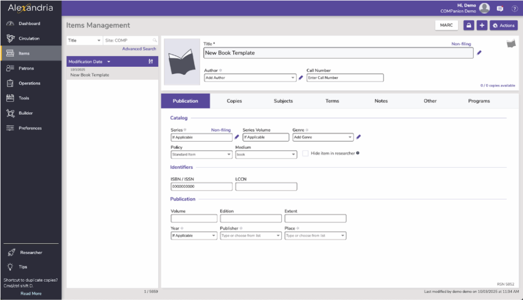 Did you know that when adding items manually into Alexandria, you can create MARC record templates? Then, when you add a title, you can just duplicate a template and fill in the information for that title. Let’s go through how to make a MARC record template step-by-step.