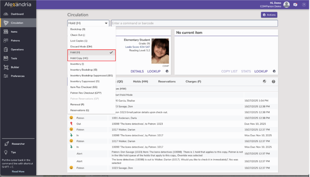 • Hold Copy or the HC command places a hold on a specific barcode of a copy for the Current Patron, such as a teacher’s edition of a title.