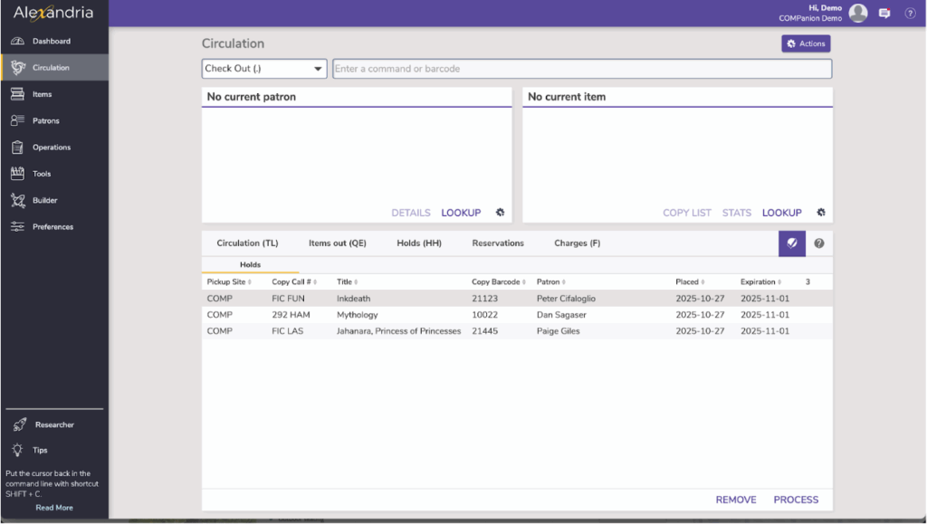 • Once you have pulled the holds from your shelves, you can bookdrop and print the hold receipt and put it on your hold shelf. You can also accomplish this by pressing Process at the bottom right of the tasks tab.