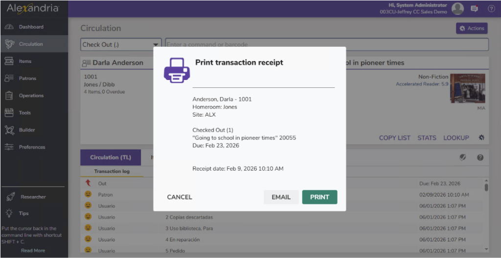 Miss Honey needs to set up patron alert notes for several students, because some states and school districts require the ability to notify parents of what patrons are checking out from the school library. Patron alert notes can help her remember which patrons need printed or emailed receipts.