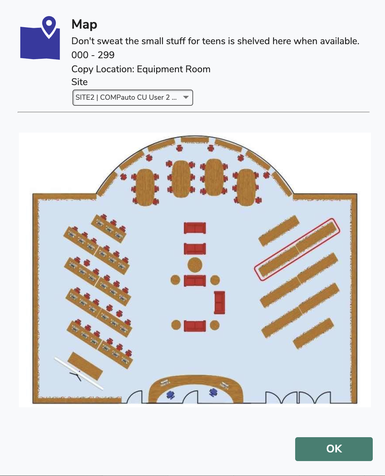 If a map is available for your copy’s call number range, a Map icon appears at the bottom of Scout’s Item Details.