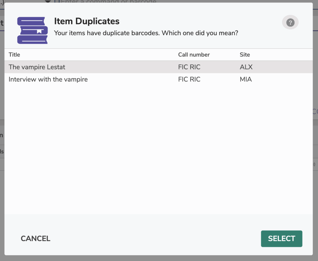 - If you enter a copy barcode that exists at another site AND your site, it will always use the record that belongs to your site, unless the other record is marked as being away from home (e.g. in transit or in inter-library loan).