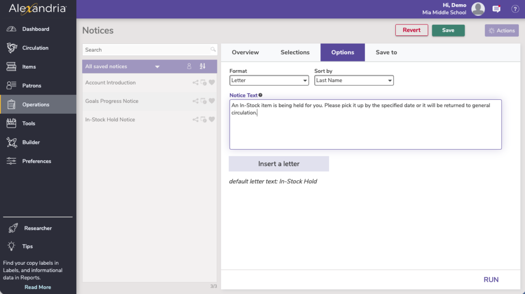 Use: Librarians and teachers can run this report to get notices for students in a particular group or class who have in-stock holds. Consider creating some saved notices that automatically send out this report: