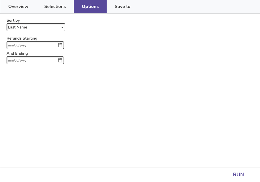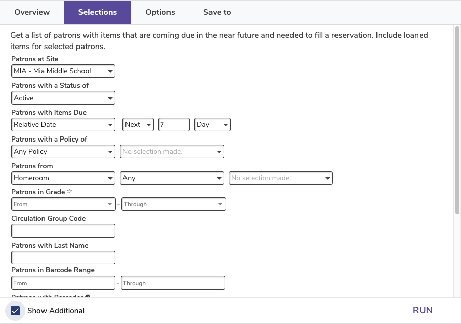The Selections tab is where you build the report to suit your needs. If you find some of your reports lacking the necessary selection information, try checking the Show Additional box for more options. The settings in this tab vary per report.