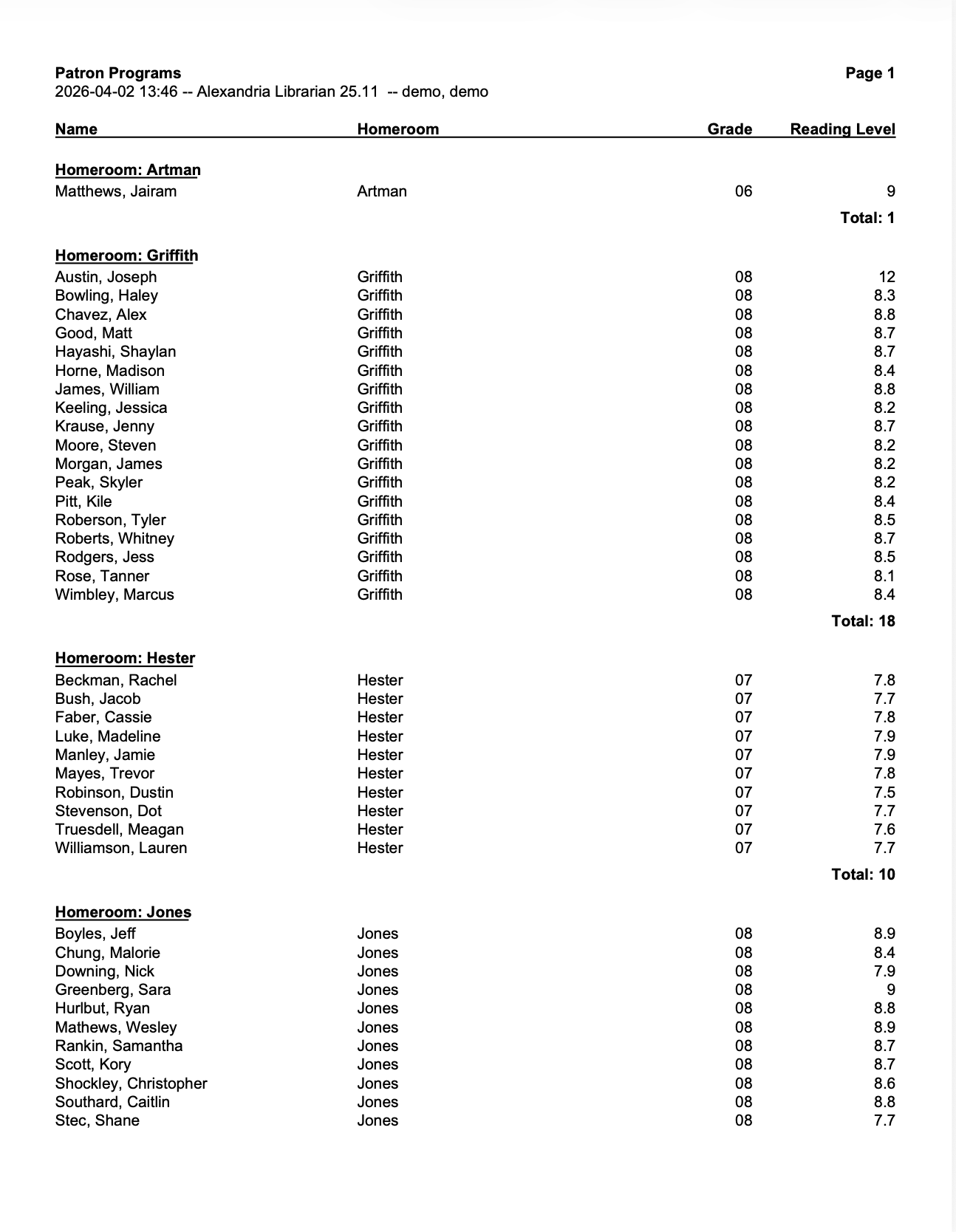 - Run this report to get a list of patrons and their Lexile/reading level along with grade and homeroom information to help you see trends.