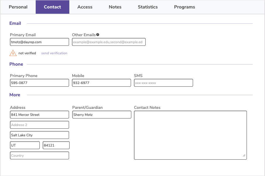 Use this field to enter notes on how to contact this patron or the patron’s legal guardians. You can also use the Contact Notes field to track names, additional phone numbers, and email addresses.