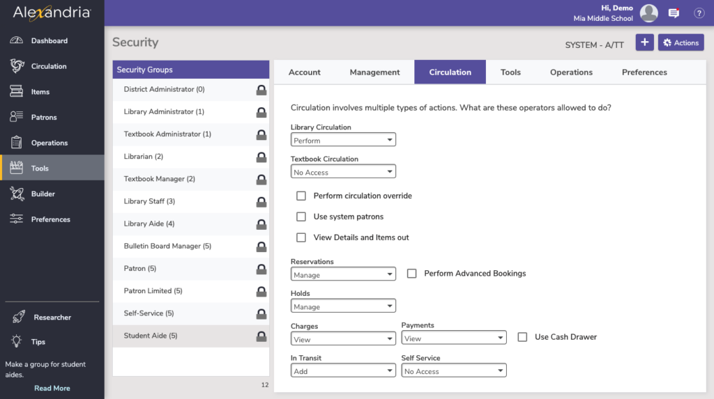 Do you have student aides helping with circulation? You might not want them to have access to items another student has checked out. We’ve added a new security option for ‘View Details and Items out’, so you can turn this off for any relevant security group.