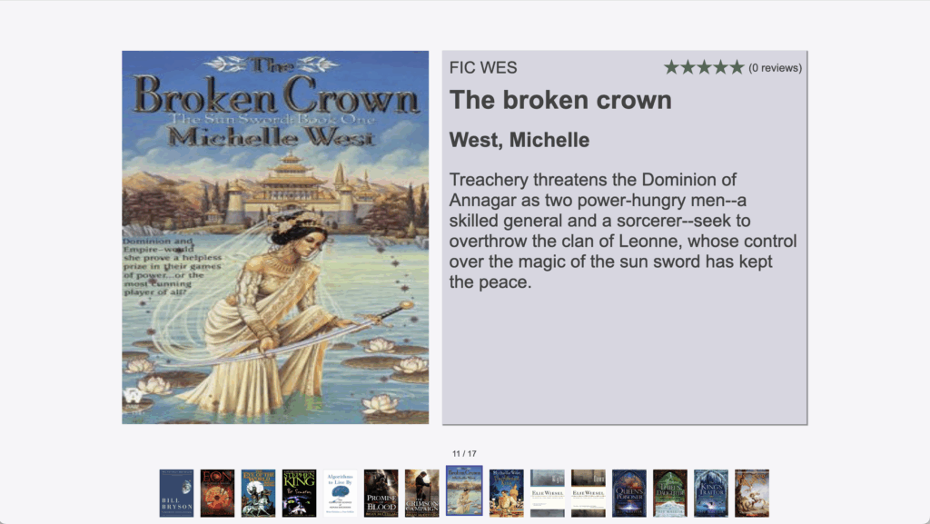 Alexandria’s Slideshow is a fun way to dynamically display a range of titles from search or saved results to promote a theme or subject. You can run Slideshow on a TV monitor, or set it up on a computer or tablet so patrons can select items in the list. It’s a great way for your students to see some of the items available in your library without logging in to Researcher.