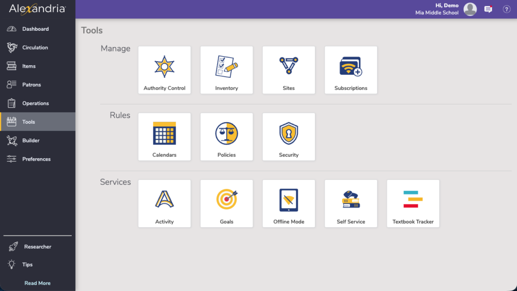 Access Tools from the sidenav or by appending /tools to your Alexandria URL.