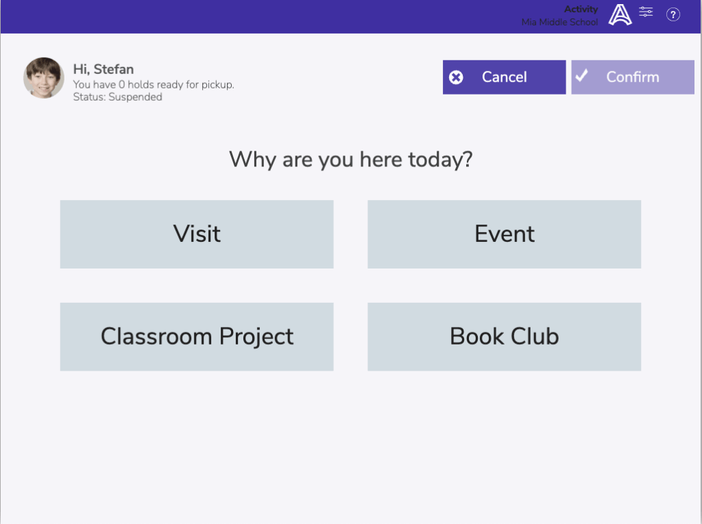 - The patron’s picture, name, status, and number of in-stock holds will pop up. Patrons can then select their activity and click Confirm in the top right corner.