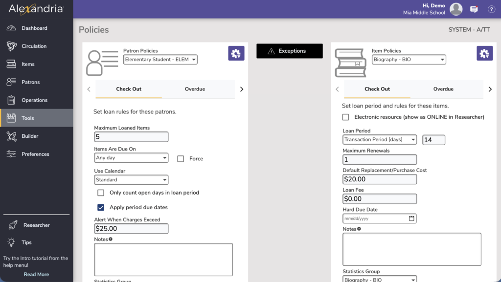 ![]() | Many school libraries and public libraries create policies based on their patron’s age and/or grade. Alexandria does not automatically change or set any patron policies just because a policy matches their age and/or grade. An operator (e.g. librarian) must set the patron’s policy either using patron imports or manually in Patrons Management. |