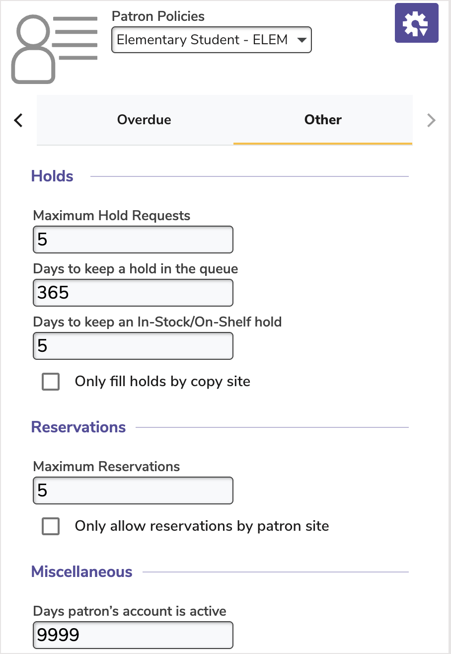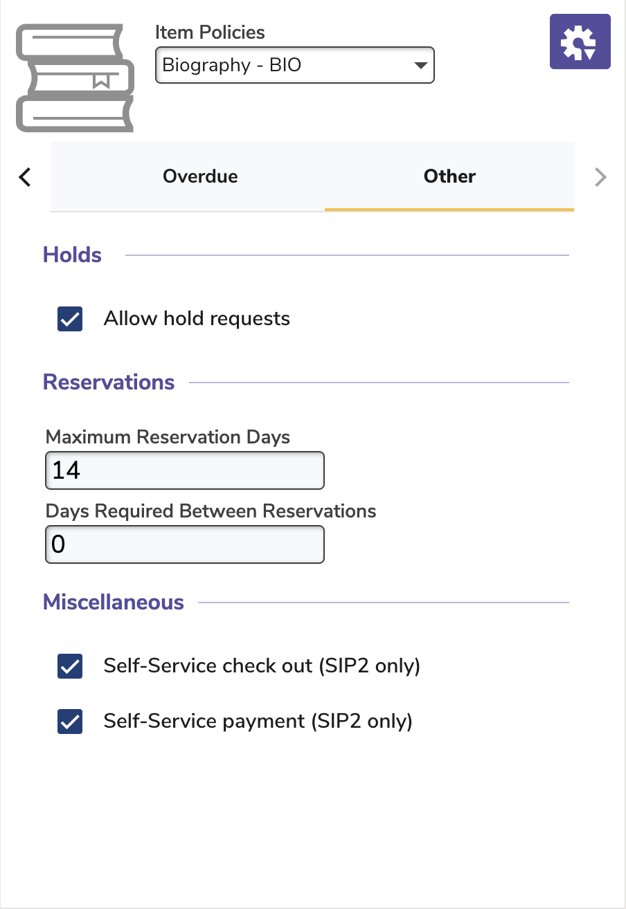 - Go through the various Policies tabs (Check Out, Overdue, Hold, Reservation, and Other), changing the appropriate values to the fields, dropdown menus, and checkboxes.