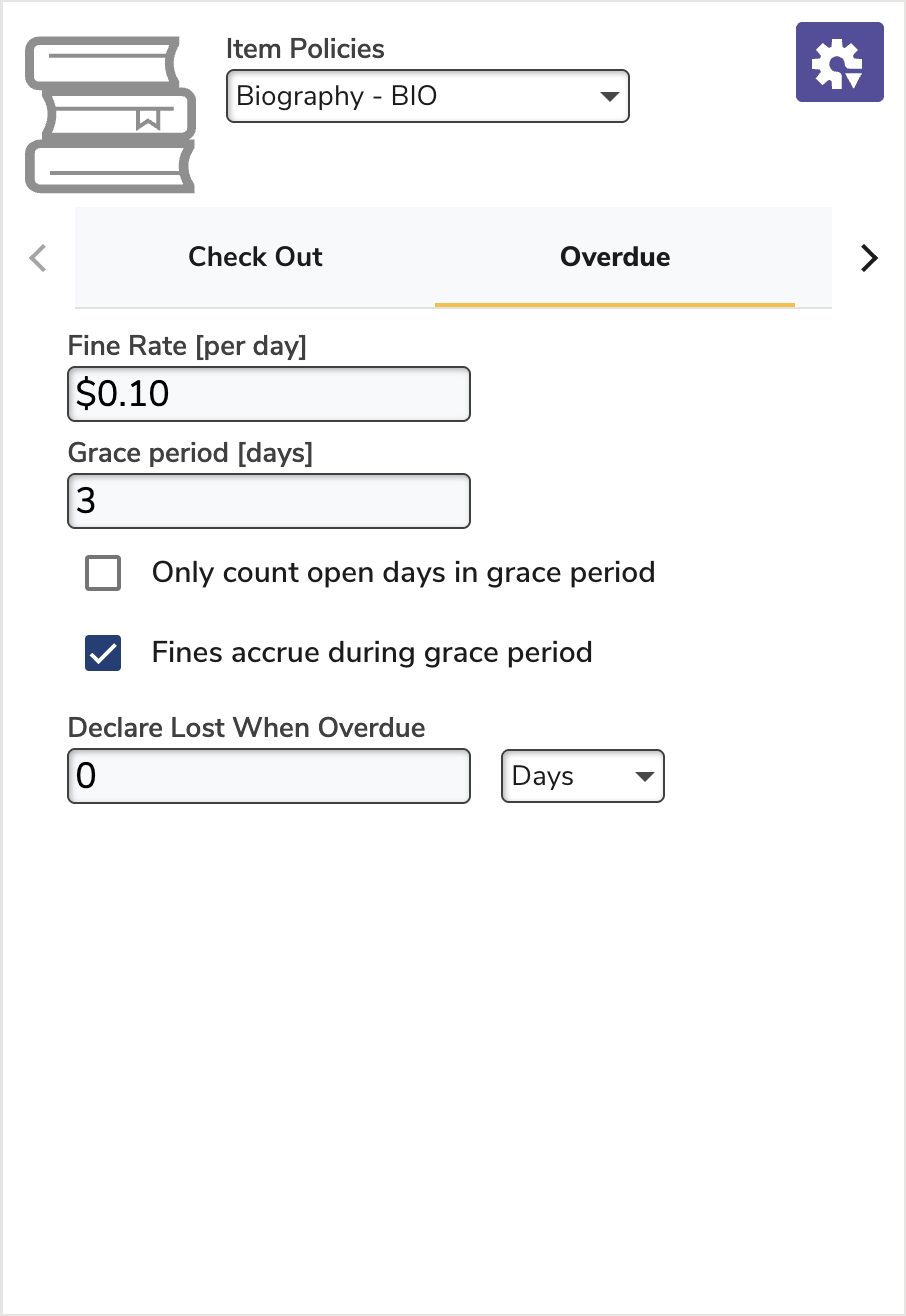 Fine Rate (Days). Set the fine rate that is charged to the patron for every day that the item is overdue (under this policy). The fine rate is computed daily. If you don’t charge fines, enter $0.00.