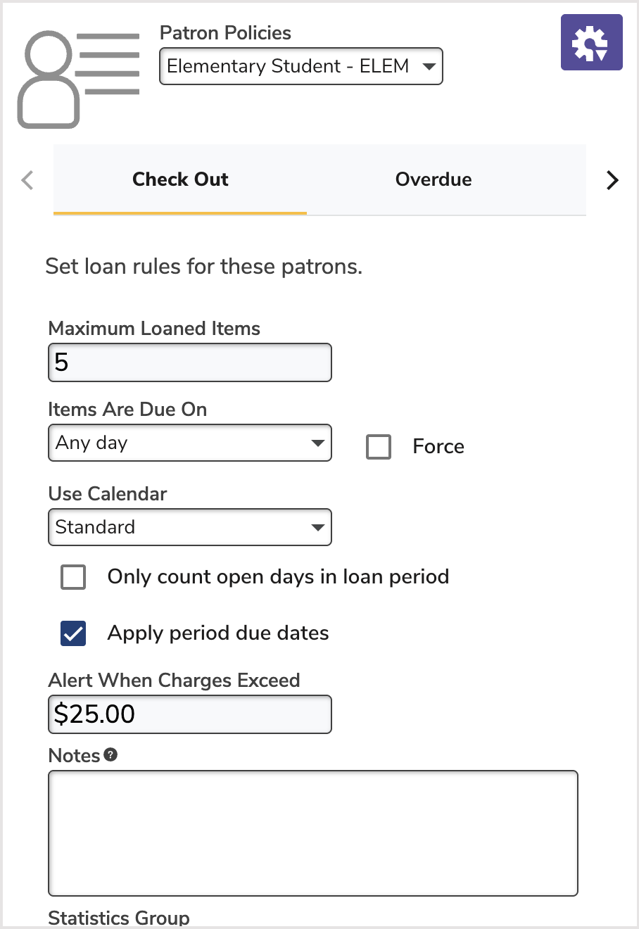 Each group of patrons and items (for which usage statistics are collected) can be assigned a separate policy. For example, if each grade level of students has its own policy, the statistics generated are more useful and accurate than if you have only one policy for all students.