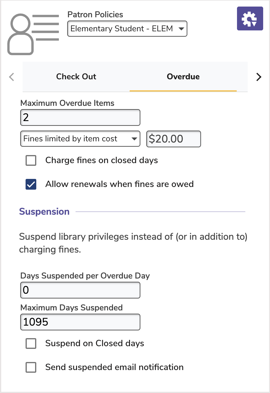 Days Suspended per Overdue Day. Enter the number of days that a patron’s library (i.e. circulation) privileges should be suspended per overdue day. For example, if the value in this field is set as 2, then for each day an item is overdue, the patron will have circulation privileges suspended for two days. If the item were three days late, privileges would be suspended for six days, beginning with the first overdue day. Note that the dialogue box in Circulation regarding this policy will NOT suspend the patron if you select “Cancel.”