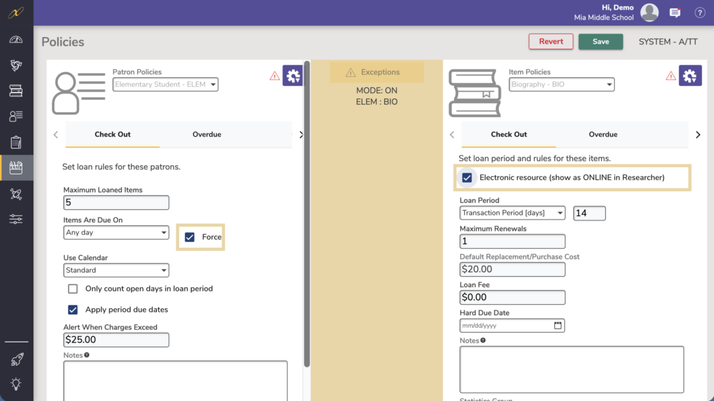 The standard settings configured in the subtabs of the Patron Policy and Item Policy sections are the general rules for the selected patron and item groups (e.g. 6th Grade and eBook). Exceptions to these rules are set in an appropriate combination of a patron and item policy. Exceptions mode allows you to modify the behavior and relationships between selected patron and item policies to further customize your policy settings.