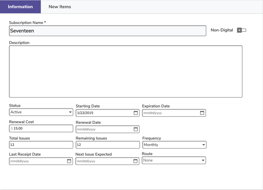 - Frequency. Use this drop-down menu to select the subscription’s frequency; if you don’t adjust the Issues Remaining field in conjunction with the Frequency drop-down menu, then the Expiration Date field will default to today’s date. Default is Irregular.