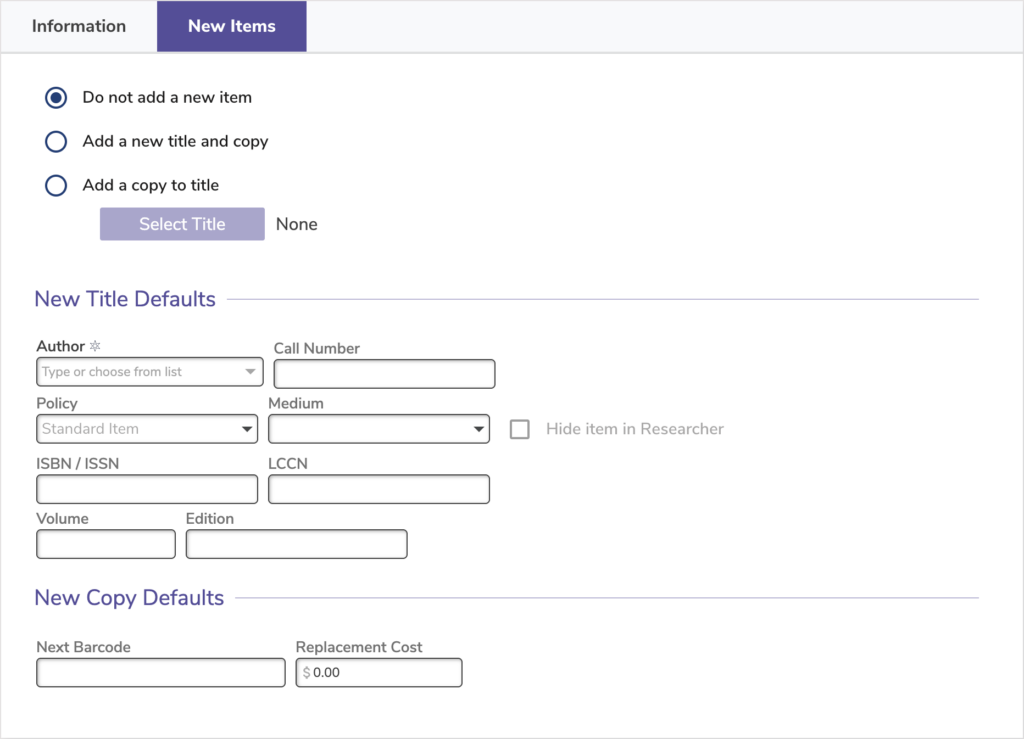 If you’re adding new titles and copies, use these settings to create your new item records.