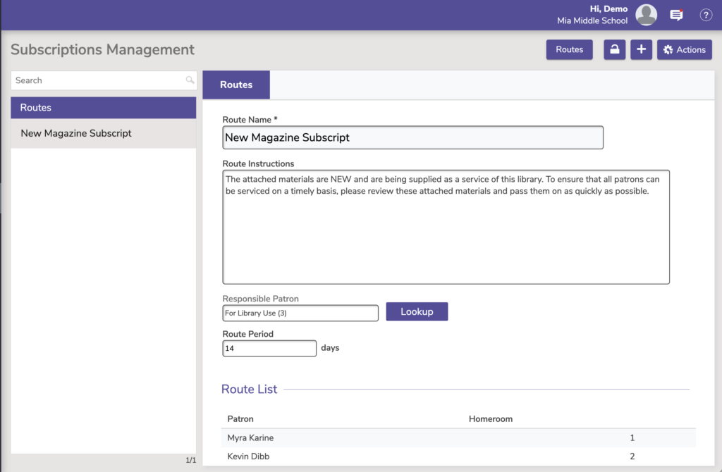 - Route. Select the routing slip you want printed when the issue is received. If you don’t want a routing slip printed, select None. The issue is automatically checked out to the Route’s Responsible Patron when the routing slip is printed.